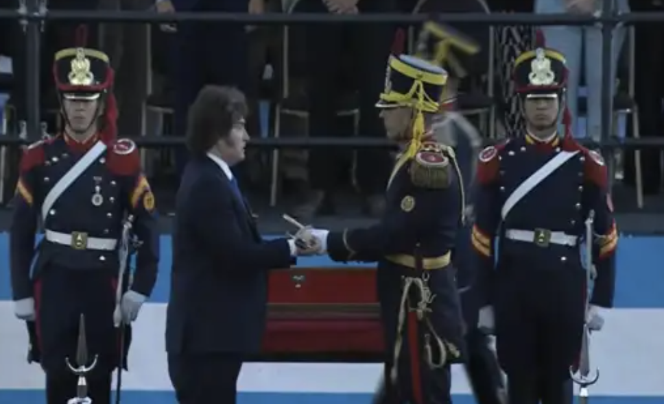 "El sable fue robado dos veces por la juventud peronista en 1963 y 1965 en actos de terrorismo", indicó Milei, repasando los distintos períodos en la historia de ese signo de la gesta sanmartiniana.